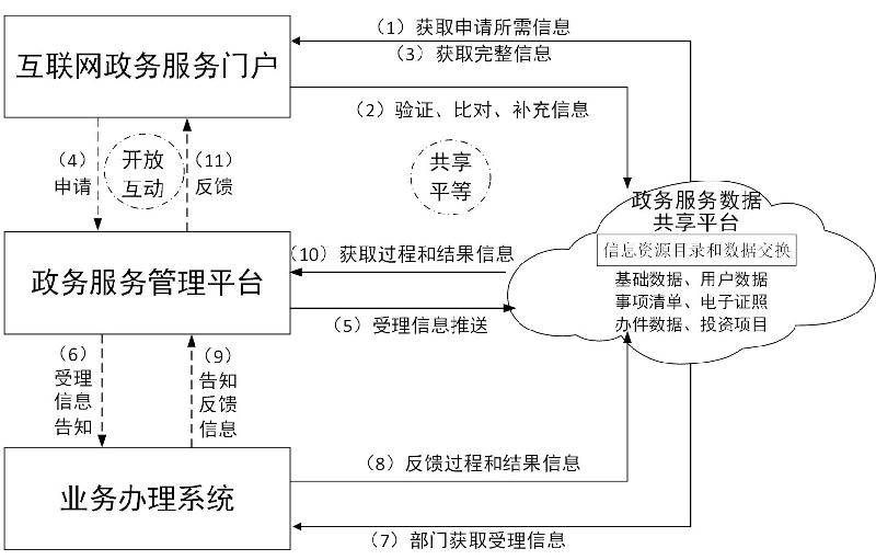 ——业务办理系统:是业务部门进行内部审批的专业系统,主要在政务服务数据共享平台取得申请信息和相关信息后进行业务办理,并将办理过程和结果信息推送至政务服务数据共享平台,同步告知政务服务管理平台。根据实际,部门的业务办理系统可与政务服务管理平台合并。